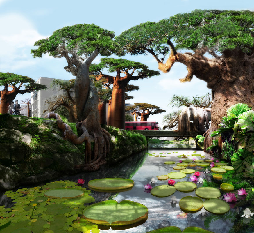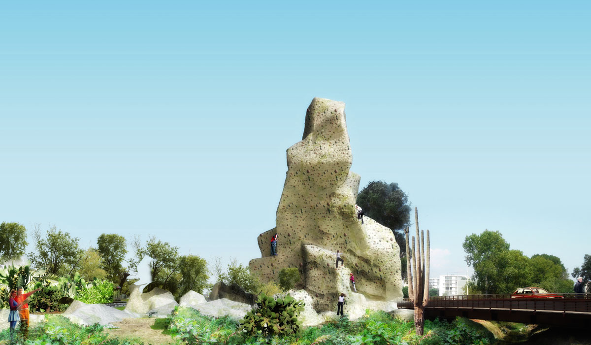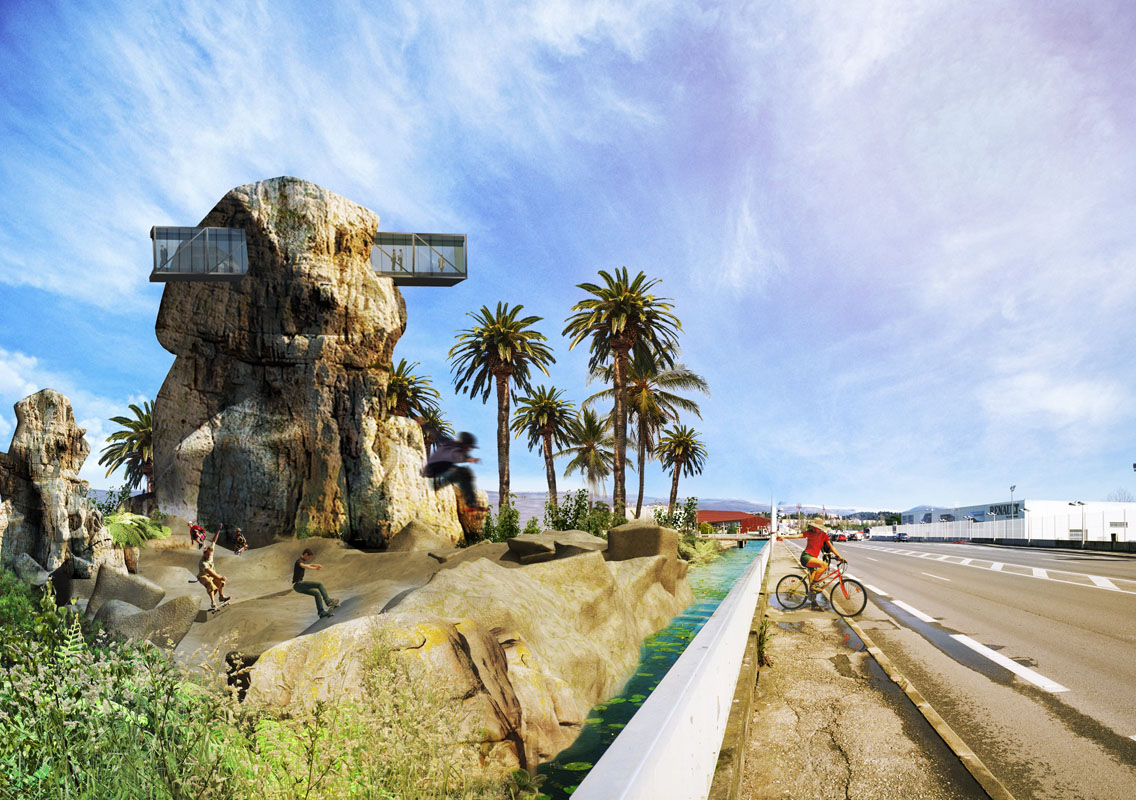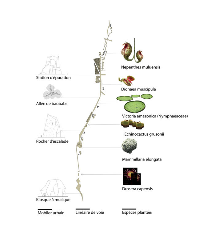 De nombreuses installations de conception inédite viennent s’implanter sur le trajet : une montagne d’escalade, une aire de jeux crée autour d’un volcan aquatique en irruption, un skate park coulé dans un cratère, un parc zoologique conçu dans un univers tropical, des mangroves surmontées de passerelles, des baobabs en béton reconstitués accueillant