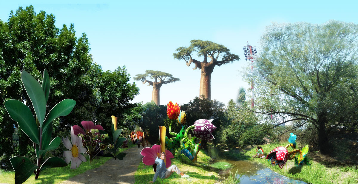 Le territoire se métamorphose par l’installation d’un jardin paysagé devenant une oeuvre monumentale, qui s’écrit par le scénario d’une aventure exotique, primitive et extraordinaire.