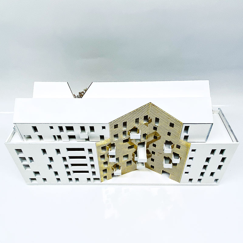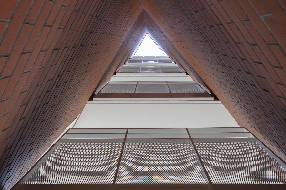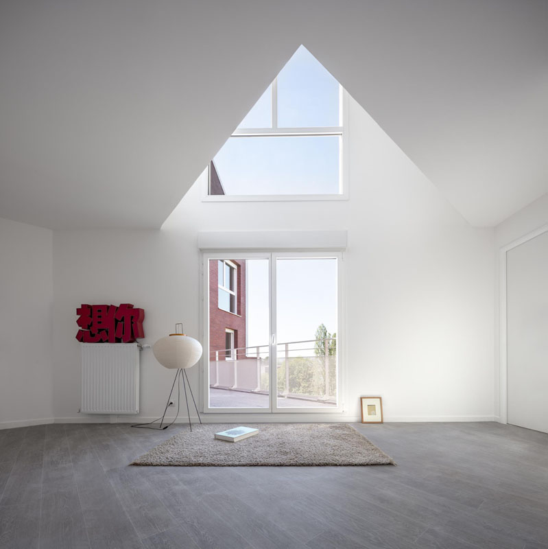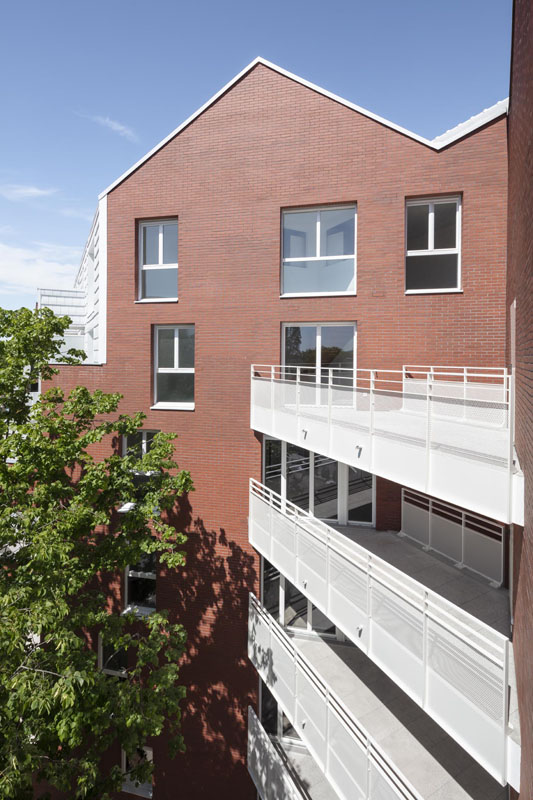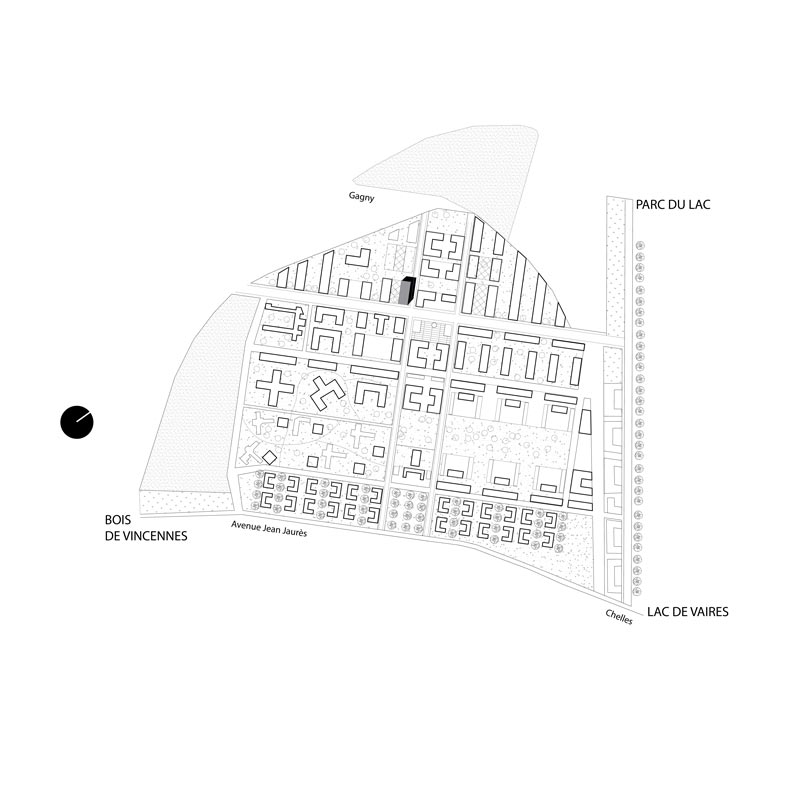 The rectangular shape, imposed by the specifications, is notched over the entire height of the east facade to preserve the two hundred-year-old lime trees.