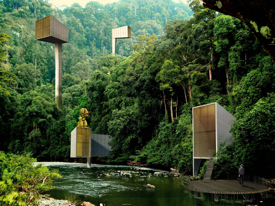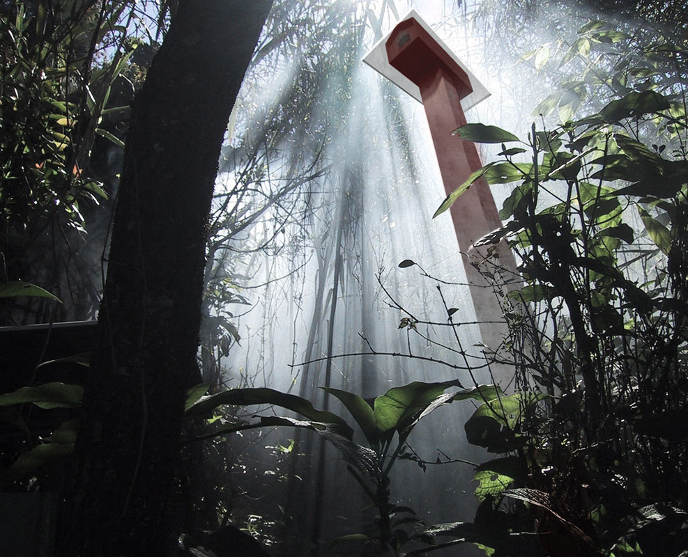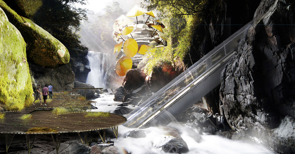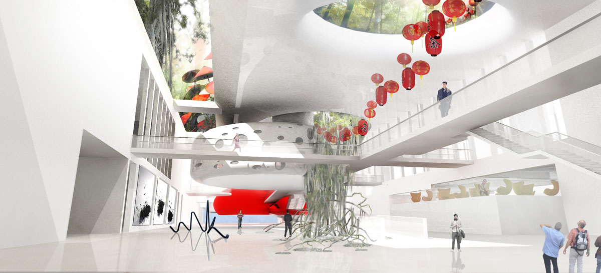 The library is covered with lacquered umbrellas to cope with the weather conditions. They filter the light and protect against violent typhoons. The administration is perched in a high house to look far into the valley and the perpetual movement of visitors. The restaurant is naturally a flying saucer placed on its circulation escalators. Each entity of the museum has perched rooms allowing the installation of works in the heart of the landscape. However, an underground main nave makes it possible to exhibit works in a volume that meets the wishes of contemporary needs.